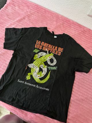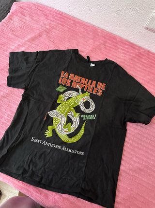 Camiseta negra con un diseño gráfico llamativo. - Estampado La Batalla de los Reptiles con un lagarto y serpientes. - Texto adicional Luchacha y La Bamba y Saint Antonie Alligators.