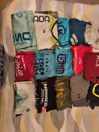 Conjunto de cinco camisetas de running, ideales para entrenamientos y carreras. - Camiseta verde con diseño gráfico. - Camiseta roja con logo 'montanejos'. - Camiseta azul con texto 'BENICASSIM'. - Camiseta azul con texto '15KM MASSAMAGRELL'. - Camiseta negra con texto 'MONACO GRAND PRIX'.