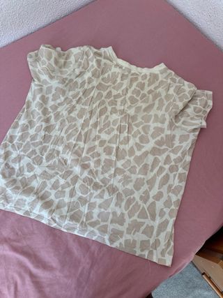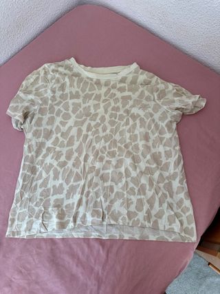 Camiseta con un diseño moderno y llamativo. - Estampado de manchas en tonos beige y blanco. - Cuello redondo. - Manga corta.