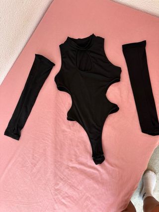 Conjunto de body negro con un diseño moderno y atrevido, incluye mangas. - Body con escote y aberturas. - Mangas largas a juego.