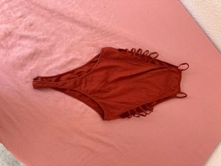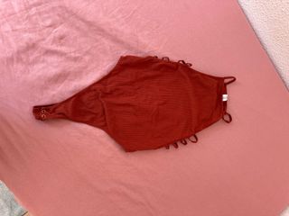 Body de color rojo con un diseño llamativo y detalles de cordones. - Tejido texturizado. - Cierre de corchetes en la parte inferior. - Tirantes finos.