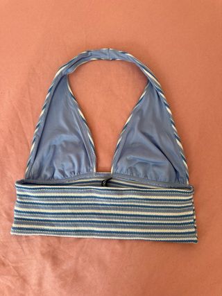 Este top halter presenta un diseño de rayas verticales y horizontales en tonos azules y blancos. Su corte es favorecedor y el tejido es cómodo. - Diseño de rayas. - Estilo halter. - Tejido elástico.