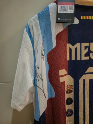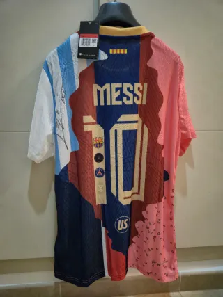 Camiseta de fútbol con un diseño multicolor con la firma de Messi y el nombre de Messi. Talla L - Diseño con paneles de diferentes colores y texturas. - Nombre 'Messi' y número '10' en la espalda. - Logos de equipos y patrocinadores. - Cuello redondo y mangas cortas.