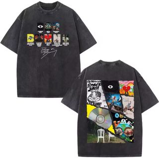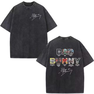 Camiseta con estampado Bad Bunny en color gris. Presenta un diseño gráfico en la espalda con el nombre del artista y referencias a sus álbumes y giras. - Estampado frontal del logo Bad Bunny. - Diseño trasero con BAD BUNNY y portadas de álbumes. - Firma del artista en la parte inferior de la espalda. Talla a elegir