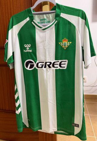 Camiseta oficial del Betis con el logo de Hummel. - Diseño a rayas verdes y blancas. - Escudo del equipo en el pecho. - Cuello redondo.
