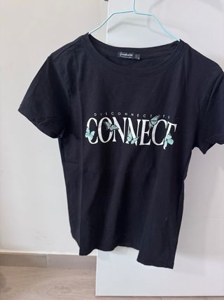 Camiseta finita de color negro. Motivo "París" en delantero con abertura y motivos plateados. Talla S/M (es muy elástica). Apenas uso.