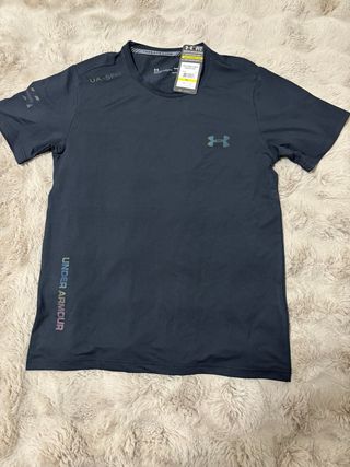 Camiseta deportiva de manga corta con un diseño moderno. - Logo de Under Armour en el pecho. - Detalle UA-Spec en la manga. - Inscripción UNDER ARMOUR en la parte inferior con efecto degradado.
