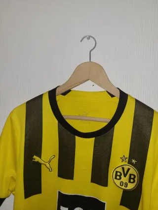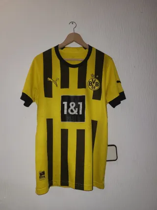 Camiseta de fútbol del Borussia Dortmund, en buen estado lo puede ver sin compromiso , original , color amarillo , talla :S , dime 70 cm de largo y de ancho 51.5 cm . - Diseño a rayas verticales amarillas y negras. - Logo de Puma en el pecho. - Escudo del club en el pecho. - Patrocinador 1&1 en el centro.