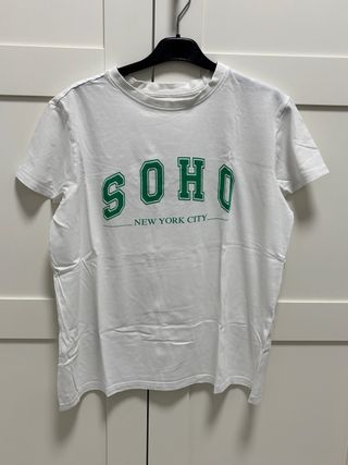Camiseta blanca con estampado SOHO NEW YORK CITY en verde. - Diseño con letras universitarias. - Cuello redondo. - Manga corta.