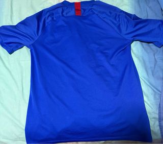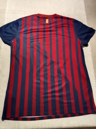 La primera equipación de la temporada 2011/12, la última del Pep. Una talla M entallada y original, ya que se sacó del Corte Inglés. Está muy amortizada, solo hay que ver las publicidades en el estado que están. Pero eso sí, está en buen estado, sin roturas. - Diseño a rayas verticales rojas y azules. - Logo de Nike bordado. - Escudo del club en el pecho. - Tecnología Dri-FIT.