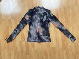 Camiseta de manga larga con un acabado plateado brillante. Es una prenda forrada, lo que le da un tacto suave. - Diseño de cuello redondo. - Mangas largas. Puesta 1 vez.