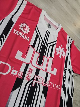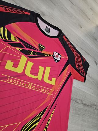 Camiseta deportiva con diseño vibrante. - Color principal rosa con detalles blancos y negros. - Logo de Yamaha presente en el diseño. - Estampado gráfico llamativo en la parte frontal y mangas.