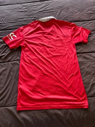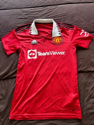 Camiseta oficial del Manchester United. - Diseño clásico en color rojo. - Logo de Adidas bordado. - Escudo del club en el pecho. - Cuello blanco con detalles.
