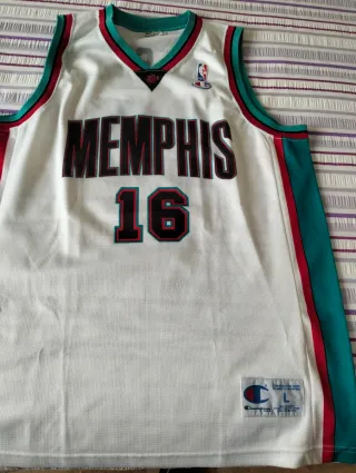 Camiseta de baloncesto de los Memphis Grizzlies. Gasol 16 - Diseño con el nombre MEMPHIS y el número 16 en la parte delantera. - Ribetes en color verde azulado y rojo a lo largo de los hombros y el cuello. - Logo de la NBA y el equipo en la parte superior.