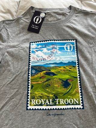 Camiseta de The Open Collection con diseño inspirado en Royal Troon. - Estampado de sello postal con paisaje de golf. - Detalle de firma en la parte inferior. - Cuello redondo.
