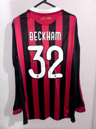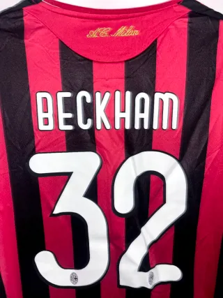 Camiseta retro de fútbol del AC Milan con el dorsal 32 y el nombre BECKHAM estampado. - Diseño a rayas verticales rojas y negras. - Cuello blanco. - Manga larga.