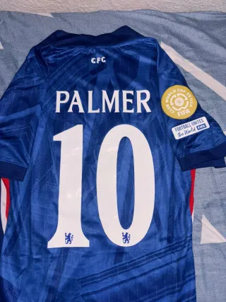 Camiseta de fútbol del Chelsea con el dorsal 10 de Palmer. - Diseño azul con detalles blancos. - Escudo del Chelsea. - Parche de la FIFA World Cup 25 USA.