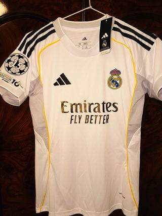 Camiseta oficial del Real Madrid para la temporada 25/26. - Diseño con detalles en blanco. - Logo de Adidas en el pecho. - Escudo del Real Madrid. - Patrocinador Emirates Fly Better.