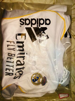 Camiseta de fútbol Adidas del Real Madrid de Bellingham con el n○5 - - Diseño en color negro con detalles dorados. - Escudo del club bordado. - Parche de la UEFA Champions League. - Logo de Emirates Fly Better en el frontal.