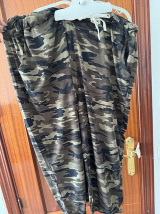 Conjunto de camiseta y malla corta, ideal para el verano. La camiseta es de color verde oliva y la malla tiene un estampado de camuflaje. - Camiseta de manga corta. - Malla corta con estampado militar.