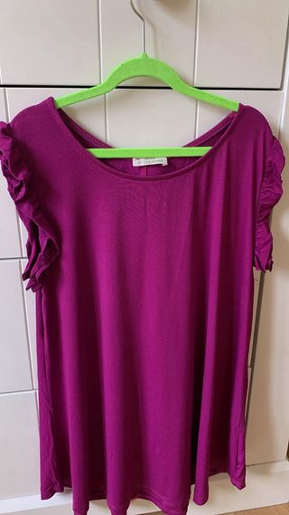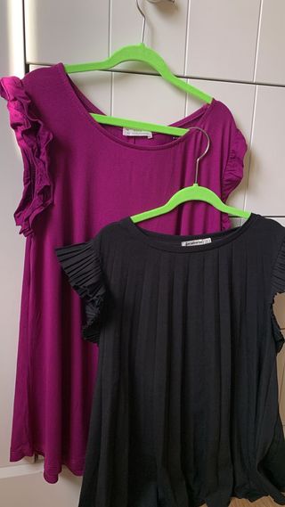 Dos camisetas con un diseño moderno y detalles que marcan la diferencia. - Camiseta morada con mangas con volantes. - Camiseta negra con mangas plisadas y detalles acanalados.