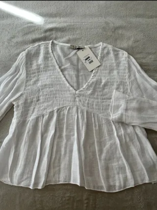 Blusa de lino y algodón manga larga con un diseño ligero y vaporoso. Perfecta para un look casual. - Tejido con textura. - Escote en pico. - Corte imperio con fruncido.