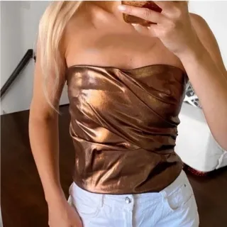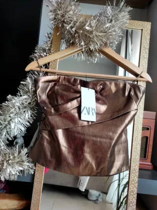 Top estilo corsé con un acabado metálico brillante. Diseño drapeado. Sin tirantes. Top de Zara en color bronce cobre. Con fruncido en el pecho. Talla S. Nuevo con etiquetas, a estrenar, sin desperfectos, lo vendo porque no es mi talla y se me pasó el plazo de devolución. Ideal para estas fiestas, Navidad, Nochevieja. Tengo más prendas de Zara nuevas con o sin etiqueta en mi armario. Hago descuento por lote.