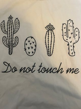 Camiseta blanca con un divertido estampado de cactus y la frase Do not touch me. - Diseño de cactus. - Frase Do not touch me.