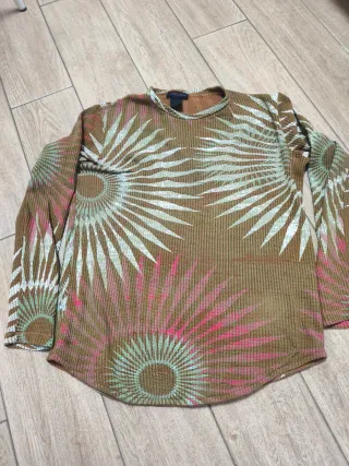 Preciosa camiseta de Custo Barcelona con un diseño vibrante. - Manga larga. - Estampado de motivos solares en tonos tierra, rosa y verde menta. - Tejido texturizado.