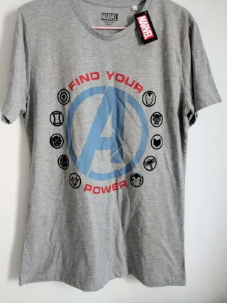 Camiseta gris de Marvel con el logo de los Avengers y la frase Find Your Power. - Diseño circular con los símbolos de los héroes. - Estampado frontal. - Manga corta.