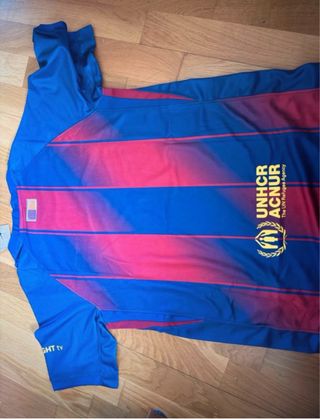 Camiseta de edición especial del FC Barcelona. - Diseño a rayas azules y rojas. - Logo de Nike. - Escudo del FC Barcelona.