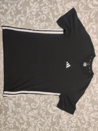 Camiseta Adidas de color negro, talla L. Diseño moderno con el logo de la marca en el centro y sus distintivas rayas blancas rn los laterales. - Logo de Adidas estampado en blanco. - Cuello redondo. - Manga corta. - Holgada - Ancha