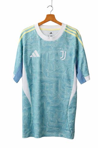 Camiseta de fútbol Adidas de la Juventus con un diseño moderno y llamativo. - Color azul y verde agua con detalles en amarillo. - Estampado gráfico único en toda la prenda. - Logo de Adidas y escudo de la Juventus. - Mangas cortas con detalles en blanco y azul claro.