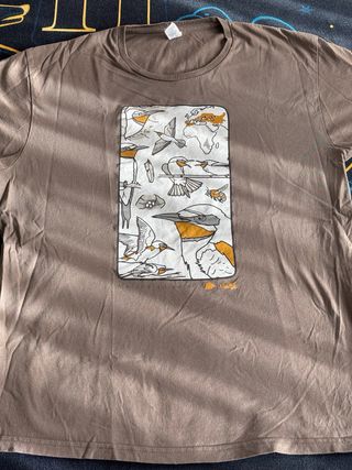 Camiseta con un diseño original de aves y un mapa del mundo. Ideal para amantes de la naturaleza. Perfecto estado - Talla M. - Estampado multicolor sobre fondo marrón. - 100% algodón Medidas: 43cm ancho y 68cm largo Envío rápido Precio negociable