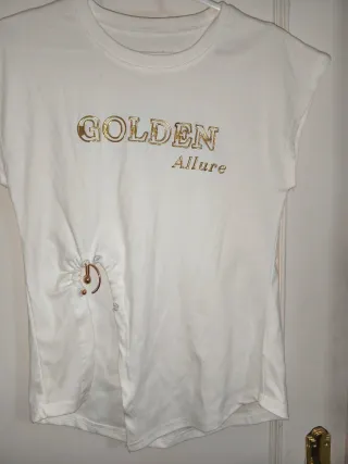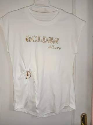 Camiseta blanca con un diseño moderno y detalles dorados. Talla M Tiene un corte en el lateral y una hebilla dorada Está Nueva