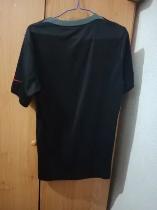 Camiseta del Paris Saint-Germain con un diseño moderno. - Color principal negro con detalles en gris. - Escudo del club en la parte frontal. - Logo de la marca en la manga.