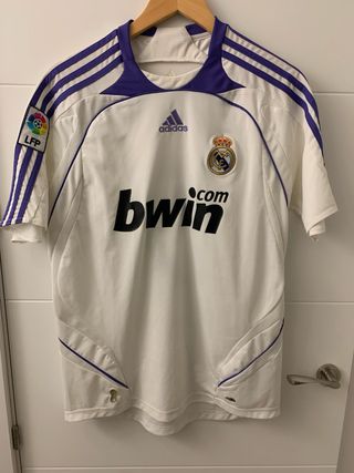 Camiseta de fútbol retro del Real Madrid, marca Adidas y temporada 2007-2008. Del mítico jugador Ruud van Nistelrooy, que nos dio 2 ligas consecutivas. Apenas usada, fue un regalo de mis tíos y, por desgracia, engordé en poco tiempo y me la puse 2 veces literalmente. Es una lástima porque no me apetece deshacerme de ella, pero estoy seguro q alguien le podrá dar más uso. Desconozco si es original o réplica (muchos me habéis preguntado x las etiquetas, solo tiene la típica de las intrucciones d lavado y la tinta se ha desvanecido de lavarla). Diseño clásico en blanco con detalles morados. Logo de Adidas, LFP y escudo del RM bordados.