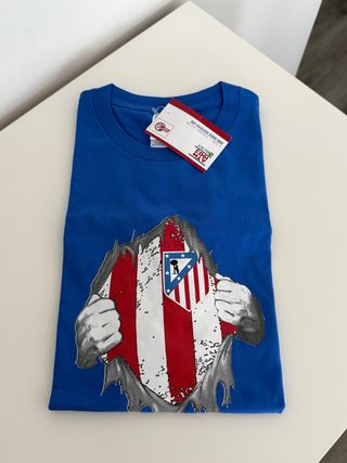 Camiseta del Atlético de Madrid en color azul. Presenta un diseño gráfico frontal que simula la camiseta del equipo. Nueva con etiquetas. - Camiseta oficial del Atlético de Madrid. - Diseño con el escudo del club. - Talla S