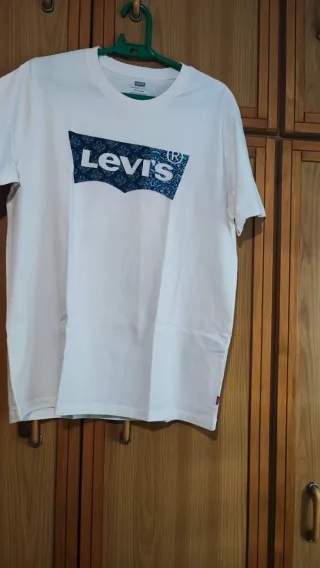 Lote de cuatro camisetas de la marca Levi's. - Dos camisetas blancas con el logo grande. Talla S y M - Una camiseta azul con franjas y logo. Talla XS - Una camiseta azul lisa. Talla M