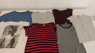 Conjunto de siete camisetas de manga corta para mujer. - Variedad de diseños y estampados. - Algunas son de rayas y otras lisas. - Incluye una camiseta con estampado gráfico.