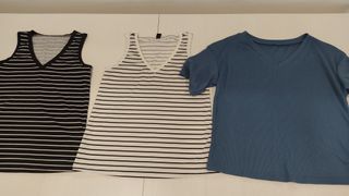 Conjunto de tres camisetas. - Camiseta de rayas blancas y negras. - Camiseta de rayas negras y blancas. - Camiseta azul de tejido gofrado.