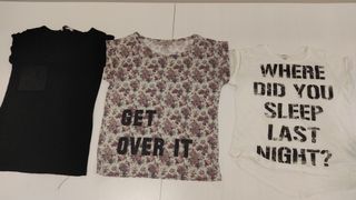 Conjunto de tres camisetas para mujer. Lote 9€ - Camiseta negra con bolsillo. - Camiseta estampada floral con texto GET OVER IT. - Camiseta blanca con texto WHERE DID YOU SLEEP LAST NIGHT?. - Talla M.