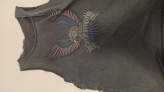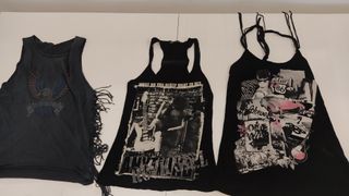 Conjunto de tres camisetas de tirantes con diseños llamativos. Lote 7€ - Camiseta gris con estampado de águila y flecos laterales. - Camiseta negra con estampado gráfico y texto. - Camiseta negra con collage de imágenes y texto.