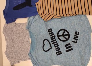Conjunto de cuatro camisetas para mujer. - Camiseta azul con estampado de conejo Little Rabbit. - Camiseta azul con estampado Boutique In Live y símbolo de la paz. - Camiseta gris jaspeada. - Camiseta de rayas marrones y negras.