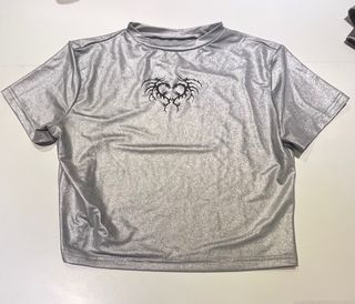 Camiseta plateada con un diseño gráfico en el pecho. - Diseño de corazón tribal. - Manga corta. - Cuello redondo.