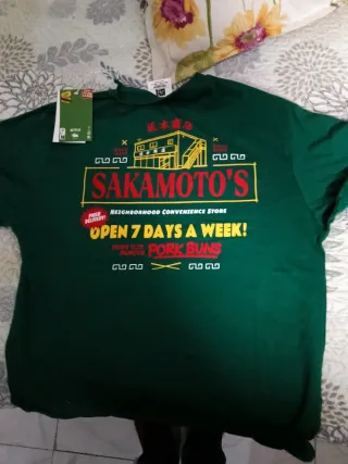 Camiseta de manga corta con estampado inspirado en Sakamoto Days de Netflix. - Diseño Open 7 Days A y Neighborhood Convenience. - Detalle de Free Delivery!. - Estampado frontal con el logo de Sakamoto Days y elementos gráficos. - Color principal verde oscuro.