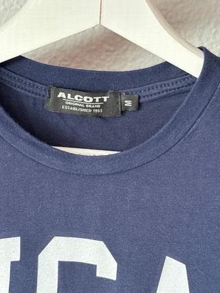 Preciosa camiseta de algodón de la marca Alcott. Es de color azul marino y tiene un diseño chulo con la bandera de Estados Unidos y la palabra "USA LEAGUE". Está en perfecto estado. Hombre. - Talla M - Corte clásico - Estampado de alta calidad