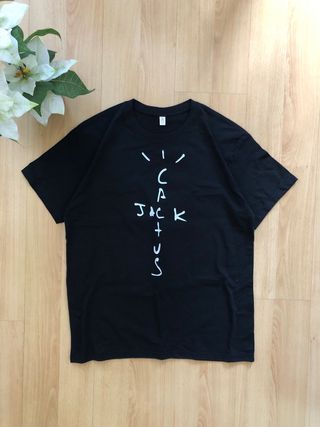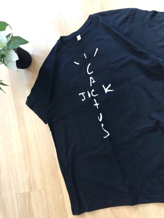 Camiseta negra con un diseño gráfico distintivo de Travis Scott. - Estampado blanco con el nombre Cactus Jack.
