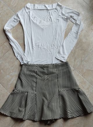 Conjunto de dos piezas falda con pantalón debajo y camiseta. Talla 38 - Camiseta negra de manga larga con escote en V. - Falda corta con estampado de puntos.