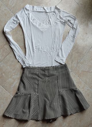 Conjunto de dos piezas con camiseta de manga larga y falda ( con pantalón corto debajo) Talla 38 - Parte superior de canalé negro. - Falda con estampado de lunares blancos sobre fondo negro. - Diseño acampanado en la falda.